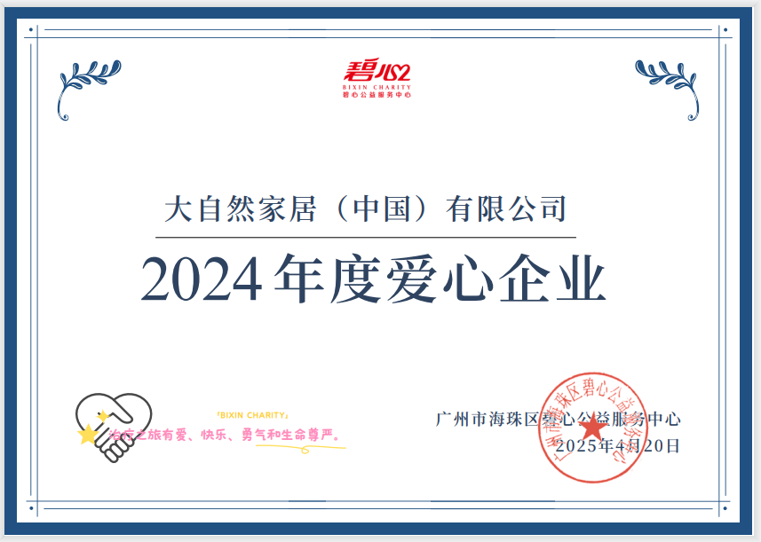 大自然家居堅持“擔環(huán)保責任、普健康生活、做健康家居”的企業(yè)使命。2006年,大自然推出“中國綠色版圖工程”,至今每年堅持公益植樹,向中國綠化基金會累計捐資2000萬元,先后在國內外組織“我為黃河種棵樹”、“我為呼吸種棵樹”、“我為孩子種棵樹”、“我為藍天種棵樹”等公益植樹活動,在國內外22個地區(qū)已種植30片生態(tài)林,植樹超100萬棵。